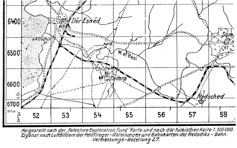 בשנת 1916 הגיעו המודדים העות'מאנים לאזורנו ובצעו מדידות טריאנגולציה מסוריה ועד לחג'אז. צוותי המיפוי עברו לארץ-ישראל לאחר השלמת המיפוי באזור מדינה שבחיג'אז בקנה-מידה 1:25,000 ו-1:50,000. בשנת 1917 הם עבדו על 12 גיליונות מהם חמישה בארץ-ישראל. מהאביב ועד אמצע הקיץ הכינו את התשתית המתמטית של רשת הטריאנגולציה, מדדו בסתיו ובחורף עיבדו באיסטנבול את הנתונים והכינו את גיליונות השדה למיפוי והפקה.